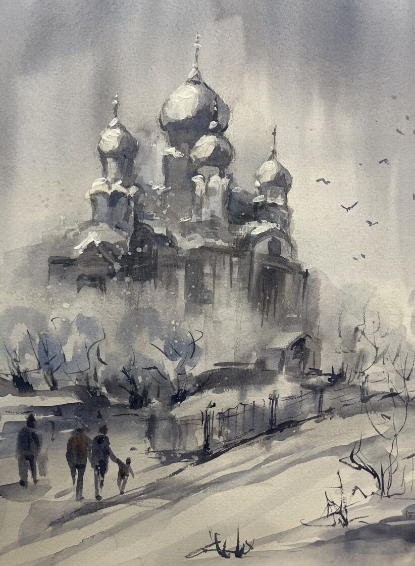 Karosta Cathedral in deep winter, watercolor / paper, 40x30 cm, framed 50x40 cm,, 130 euro -