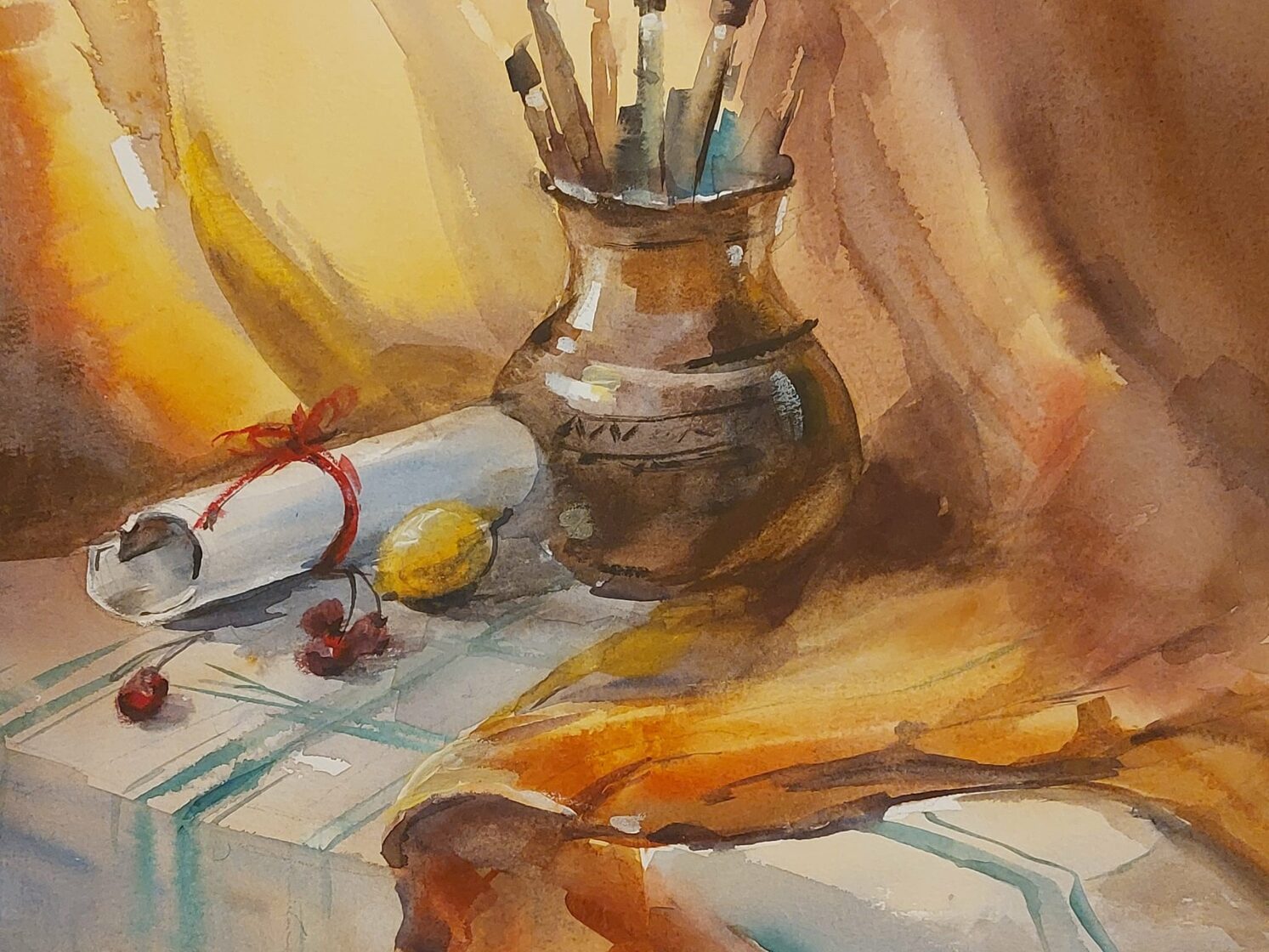 Still life with yellow curtain, Karosta, watercolor / cotton paper, 35x25 cm, 90 euro -